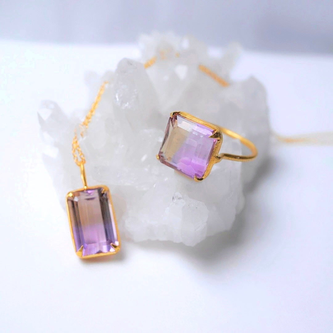 アメトリン。アメジストとシトリンが混じりあい成長した希少な水晶で、陰陽のバランスがとれた石と言われます。バイカラーが美しく近年、人気が高い石です。