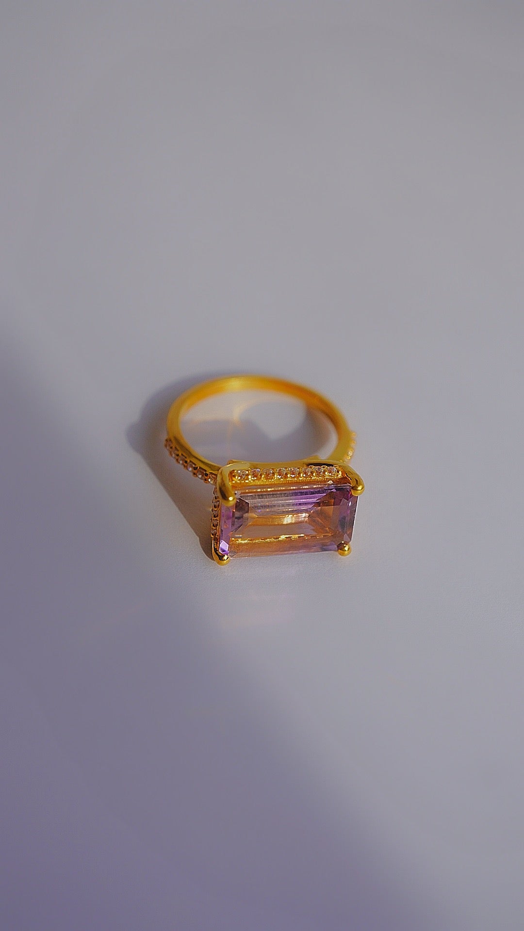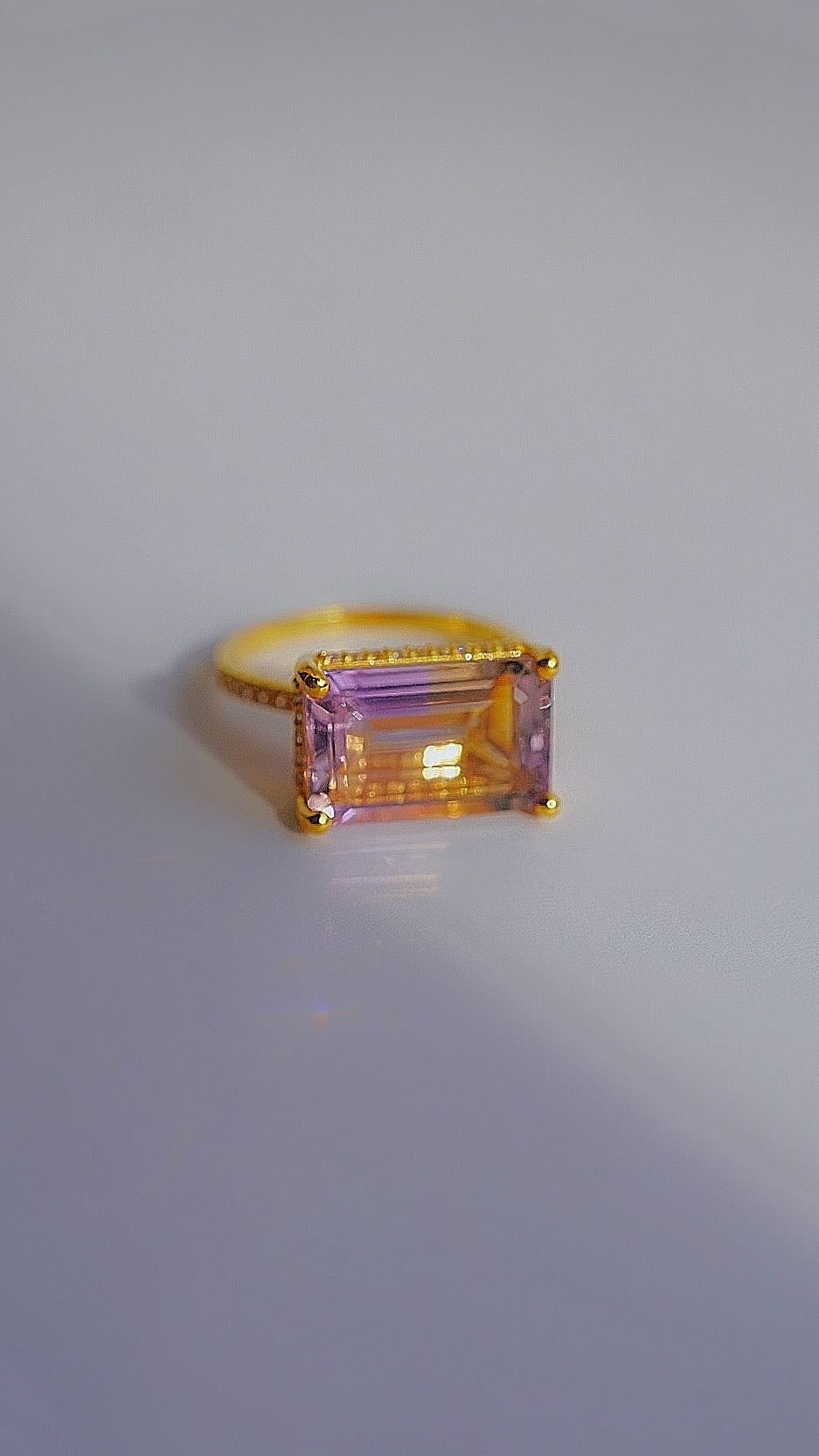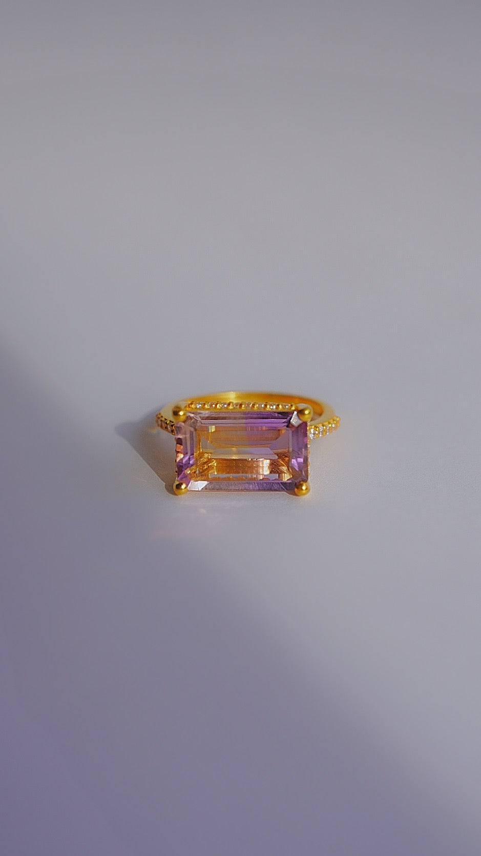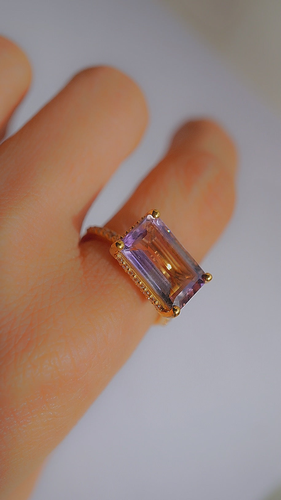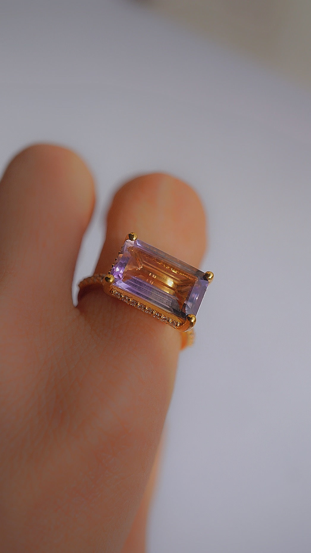 アメシストのパープルとシトリンのハチミツカラーを兼ね備えた美しい天然石のリングです。